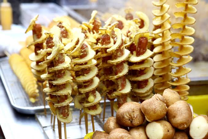 It is a deep fried spiral-cut whole potato on a skewer, brushed with various seasonings such as onion, cheese, or honey. Some varieties have spliced sausages in between.